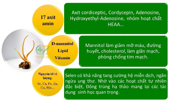 • Cordycepin: hoạt chất có tác dụng ức sự phát triển của các khối u trong cơ thể và đào thải chất độc ra ngoài, ngăn ngừa các tình trạng di căn của các tế bào ung thư.